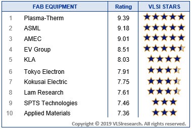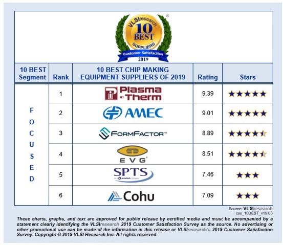 "AMEC exceeded a 9.0 rating for the first time this year and is one of just three WFE suppliers to receive five stars in the 2019 survey," said Risto Puhakka, President of VLSIresearch. "As a young company, their strong ratings show how quickly they established a world-class service infrastructure to support their global etch and MOCVD customers. The team's commitment to partnering was cited as a strength, illustrating the importance of deep customer-supplier collaborations as success-drivers for leading semiconductor and LED manufacturers."